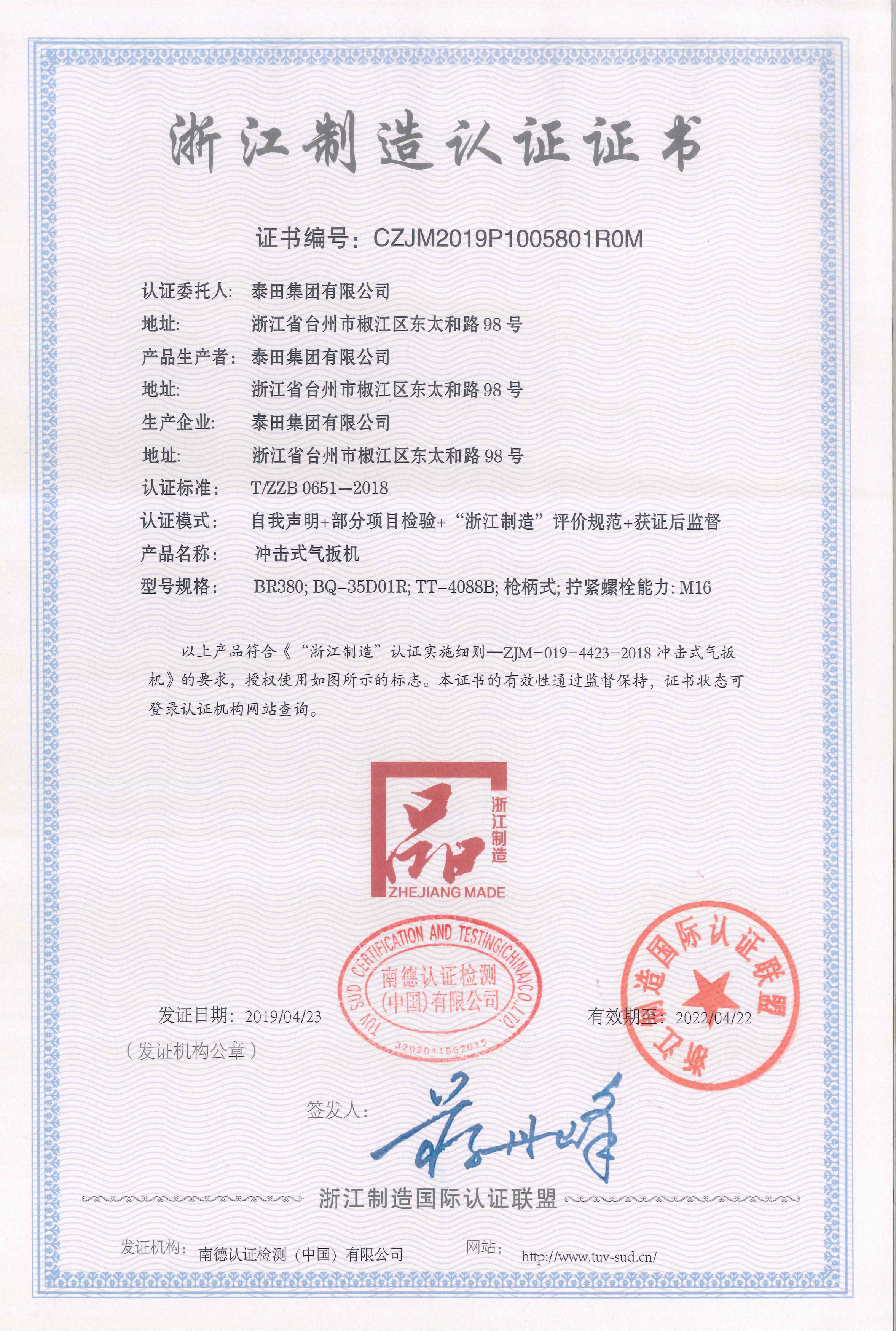 • 2019年被浙江認證制造國際認證聯(lián)盟認證為“浙江制造”